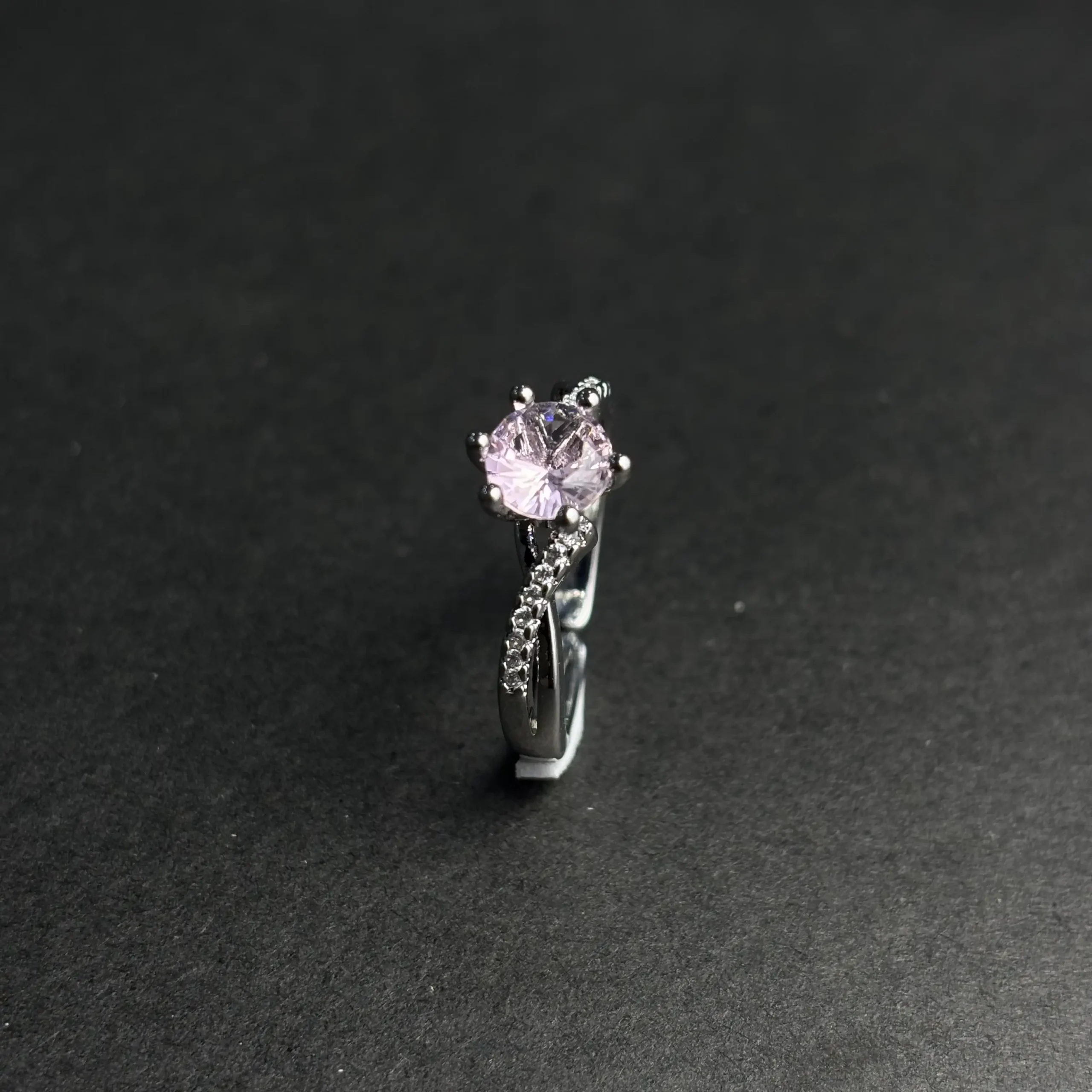 Design: The centerpiece of this ring is a beautifully cut gemstone, securely set in a delicate prong setting. The band is adorned with small, sparkling stones (likely cubic zirconia or similar), adding brilliance and sophistication to the overall design. The sleek and polished metal band complements the central stone, creating a harmonious balance between elegance and sparkle.