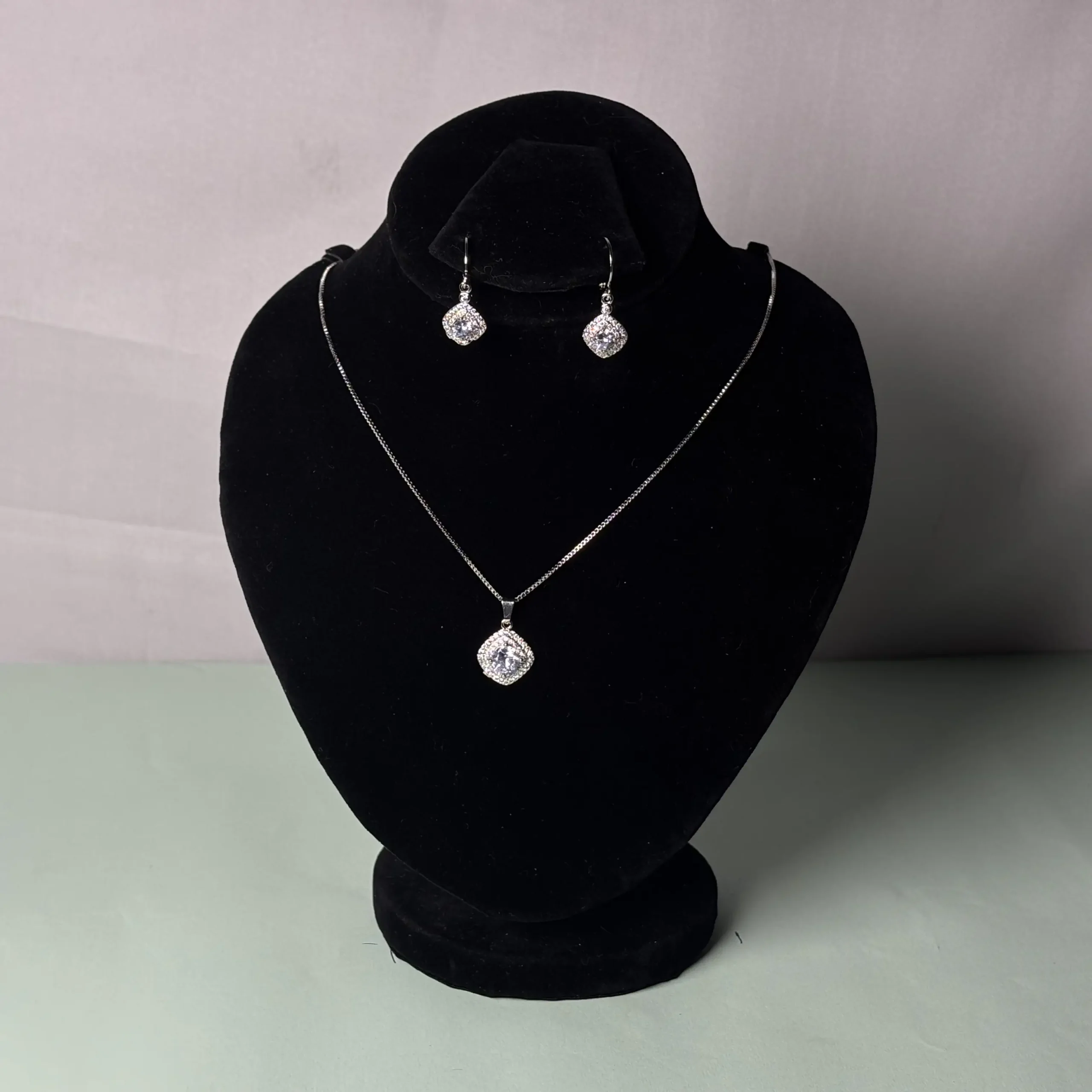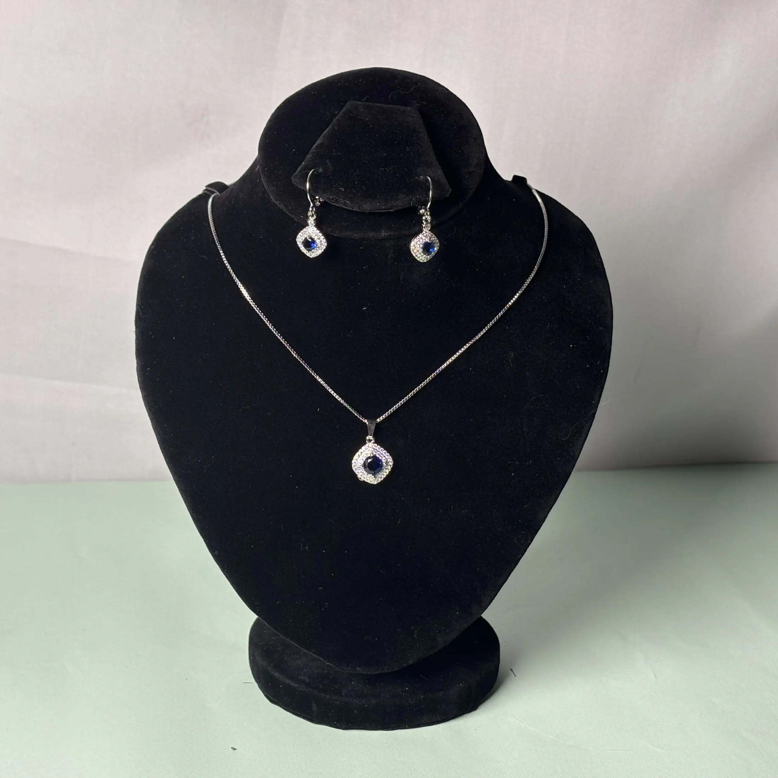 The Sapphire Serenity Set is a stunning collection of jewelry that combines elegance, sophistication, and timeless beauty. This set includes a necklace and a pair of earrings, both featuring deep blue gemstones (likely sapphires or similar stones) surrounded by sparkling white accents.
