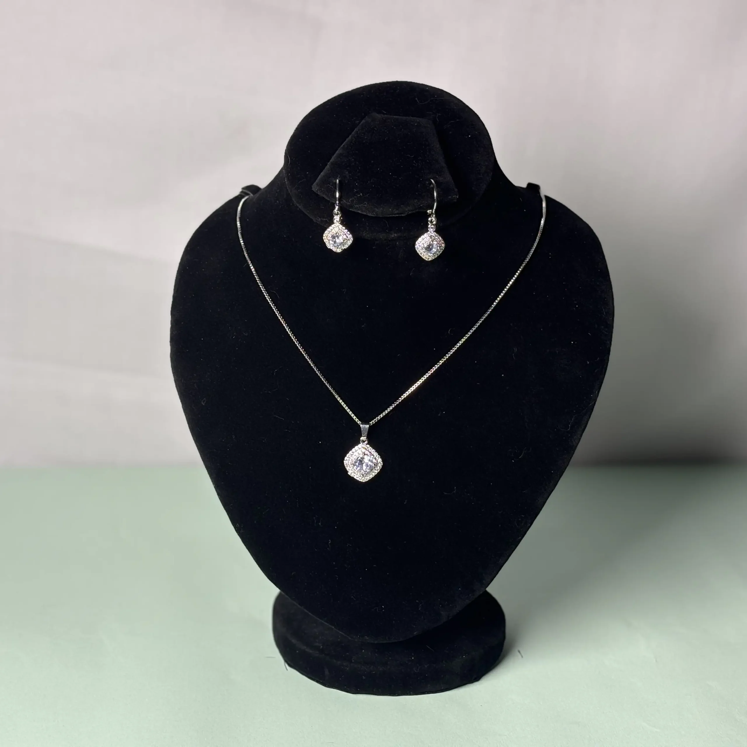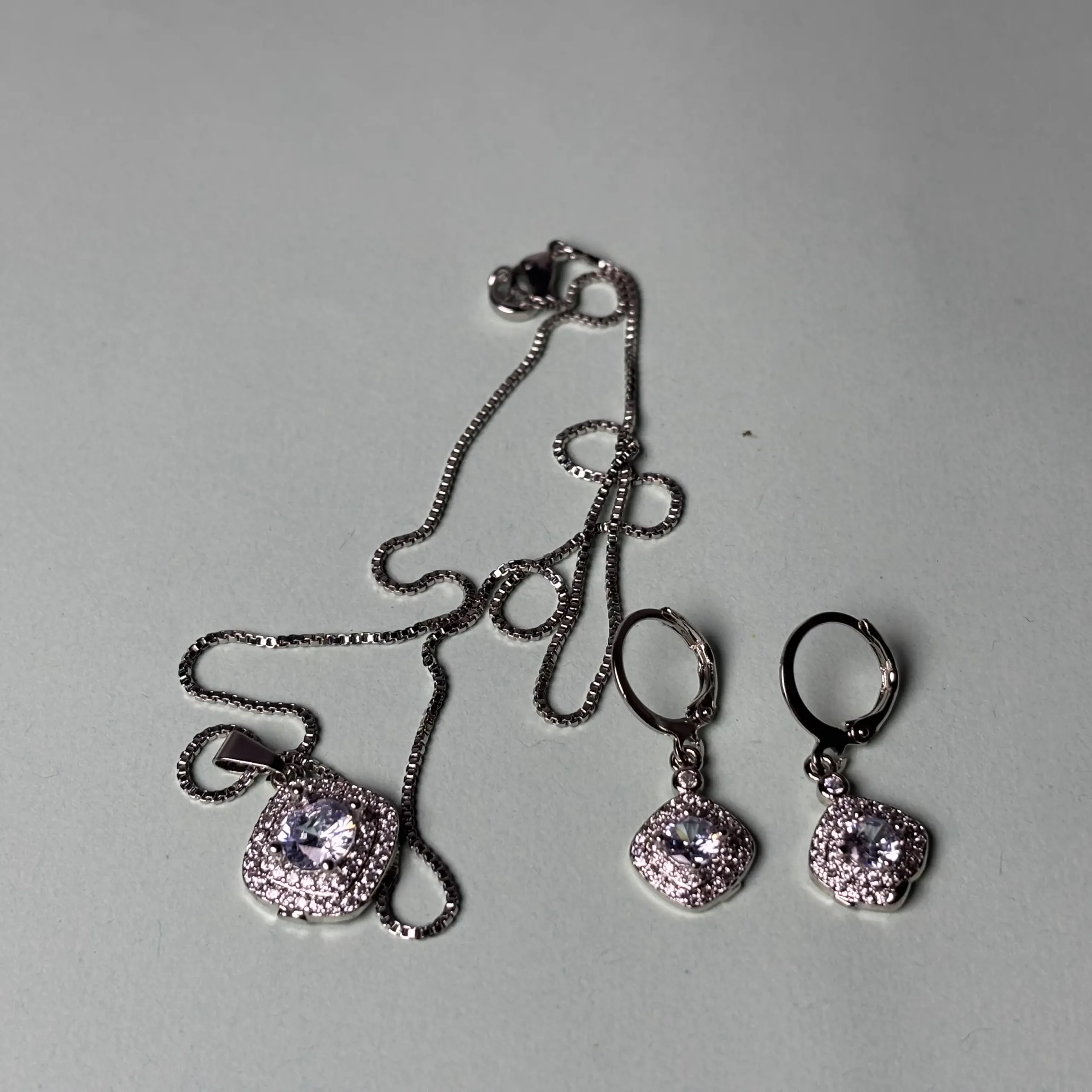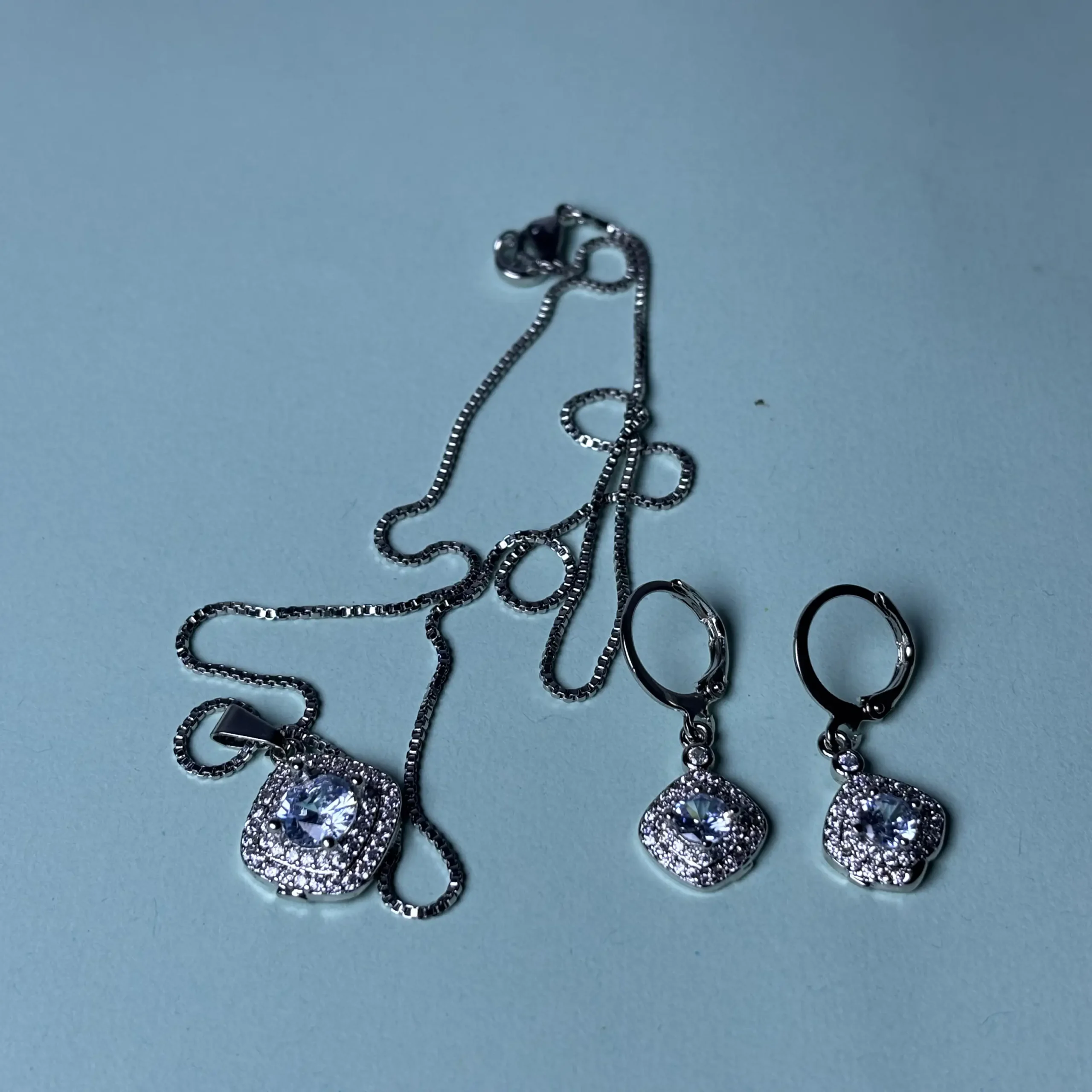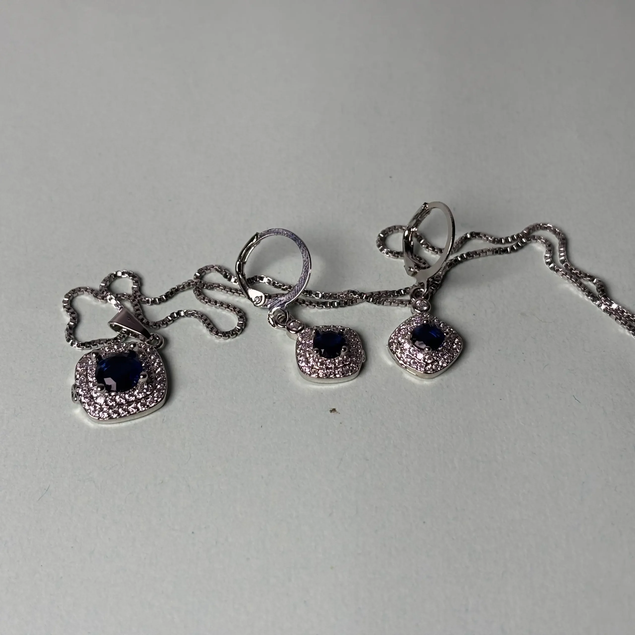 The centerpiece of this set is a delicate necklace adorned with a pendant that showcases a vibrant blue gemstone at its core. The gemstone is encased in a halo of small, sparkling white stones (possibly cubic zirconia or diamonds), creating a radiant and eye-catching effect. The pendant is suspended from a fine, silver-toned chain, which features a sleek box-link design for added durability and style. The overall look is elegant and refined, perfect for elevating any outfit.
